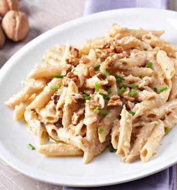 Mezze penne al pesto di noci con tranci di speck