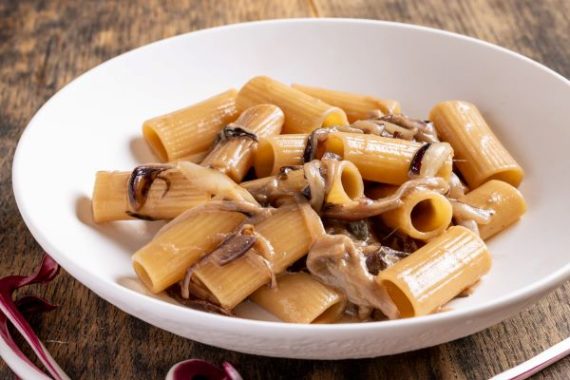 Pasta con gorgonzola dop, tranci di speck e radicchio