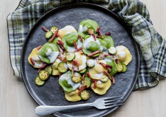 Ravioli con ripieno di ricotta e spinaci conditi con verdure miste crema di parmigiano e speck