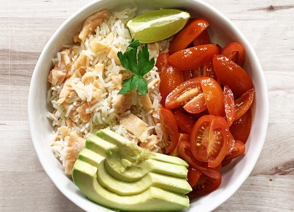 Piatto unico con riso basmati, tranci di salmone, avocado e pomodorini pachino