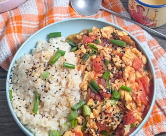Piatto unico con riso basmati, uova strapazzate, piselli rucola e pomodorino pachino