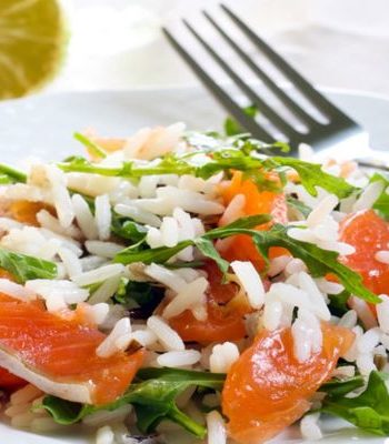 Mix di riso freddo con tranci di salmone, gamberetti rucola, e pomodori datterini